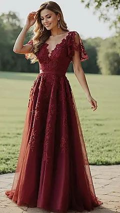 Looking at this picture, it’s pretty clear this isn’t your average “grab-a-snack-from-the-fridge” outfit. This incredible classy gown in a deep, rich red looks like it stepped right out of a fairy tale, complete with gorgeous lace details that probably took a team of fashion wizards to create. You can almost feel the “oomph” factor just radiating from it, making you wonder if the wearer suddenly feels the urge to curtsy instead of just giving a regular wave. It’s the kind of dress that makes you feel like the main character, even if your biggest event of the day is debating what to watch on Netflix.