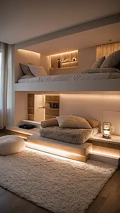 Now, let’s talk about the real MVP of this room makeover: the lighting! Those warm, glowing strips aren’t just for seeing your textbooks (pfft, like you would); they’re designed to make your space feel like a five-star hotel that also happens to let you wear sweatpants. And check out that smart layout with the bed up high! It’s like having a secret hideout for sleeping while freeing up the perfect chill spot below for sprawling out with friends or just escaping the world. This room isn’t just upgraded; it’s basically a masterclass in making a small space feel like a massive, luxurious retreat, minus the actual retreat part where you leave.