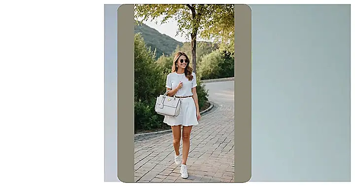 Stepping out in style, this look is absolutely nailing the fresh, sunny vibe that’s perfect for an outdoor adventure. Our friend here is rocking a super crisp white top, a cute pleated skirt, and sneakers that look ready for anything – from a casual stroll to finding the comfiest spot on the grass. She’s got the sunnies on and a big smile, giving off major “I’m about to have the best day ever” energy, all while carrying a stylish bag that probably holds a secret stash of picnic snacks or at least some emergency lip balm.