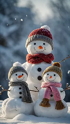 This scene is packed with so much friendly energy, you can almost feel the crisp, cool air and the soft flutter of falling snow – making it the ultimate winter wallpaper for your phone or computer. The smaller snowmen, one in a cute grey beanie and the other in a cozy pink scarf, seem to be eagerly listening, maybe plotting their escape before the sun gets too strong, or just happy to soak up the early winter sunshine. They’re a reminder that even when the days get shorter, there’s always fun to be found in the simple joy of a fresh snowfall and some goofy, bundled-up friends.