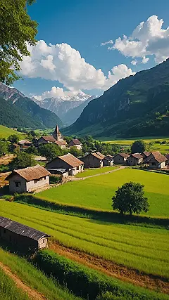This picture is like a postcard from a fairytale! Imagine living in a cozy village nestled in a valley, surrounded by rolling green hills that look like giant, fluffy carpets. The mountains tower above, looking like grumpy giants guarding their precious little village. It’s the perfect place to grab your camera and capture some seriously beautiful nature photos – I bet the sunsets here are absolutely stunning!