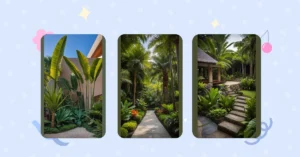 Wow, just look at this picture! It’s like someone painted a postcard, but way cooler. We’ve got these super tall palm trees silhouetted against a sunset that’s straight-up fire – like, seriously, the colors are amazing! And there’s this tiny little village house, looking peaceful as can be, nestled amongst the greenery. It’s the kind of place you’d want to visit with your friends, maybe roast marshmallows, and tell spooky stories around a bonfire (but maybe not in that little house – it looks a bit small for a party!). It’s totally beautiful, and makes you feel all relaxed.