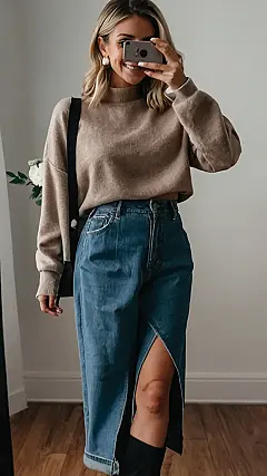 This girl’s got fall fashion down to a science! She’s rocking a comfy cardigan, perfect for when the air gets a little nippy, with a trendy denim skirt that says, “I’m cool and confident, and I’m ready for anything!” The high slit on the skirt gives her a little bit of extra sass, and she’s not afraid to show off her style. Honestly, this outfit is so cute, it might just make you want to ditch your sweatpants and embrace the fall season in style!
