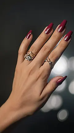 This picture shows a hand with super sleek, red nails. They’re not too loud or over-the-top, just a touch of color that makes a statement. Like, imagine you’re at a party and everyone’s wearing crazy neon colors, but you’re rocking this subtle red – you’re still stylish, but you’re totally chill about it.