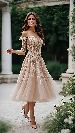 Get ready to ditch any thoughts of awkwardly showing up in jeans or, worse, something that screams ‘I tried too hard to look like the bride!’ This picture perfectly captures the vibe of the latest wedding guest outfits: chic, comfy, and totally dance-floor-ready (if you can manage in those heels, good luck!). The intricate lace and off-the-shoulder cut on this dress are like a secret weapon, making you look effortlessly stunning without accidentally upstaging anyone important. Plus, that confident smile? Probably because she knows she nailed the ‘best dressed guest’ award without even trying.