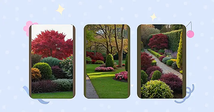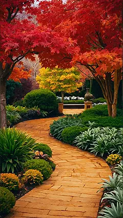 Imagine walking through a garden in the fall, the air crisp and cool. The leaves on the trees are turning fiery reds and oranges, like a giant painting splashed across the sky. This garden is a bit like that, but with even more colors! There’s bright yellow, deep green, and even some lovely purple hiding in the mix. It’s like someone spilled a rainbow of paint all over the place and then let nature do its magic.