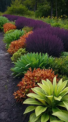 This garden looks like it’s straight out of a fairytale! With its vibrant colors and textures, it’s like a rainbow of plants all gathered in one spot. You’ve got the purple spiky flowers that look like they’re straight from a wizard’s garden, some bright orange ones that look like they might be made of candy, and some green leaves that are so perfect they could be part of a model train set. It’s pretty amazing how all these different plants can come together to make something so beautiful.