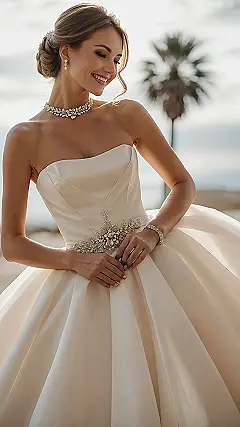 Trying to dance in this gorgeous gown might be a whole other adventure. You’d need a team just to help you spin without tripping over the huge skirt! Plus, finding enough space on the dance floor could be a challenge; you might accidentally take out a few guests or knock over the wedding cake with all that fabulous fabric flowing around. But hey, who needs to do the Macarena when you look this stunning and probably feel like a queen (or at least someone who needs a personal assistant to carry their train)?