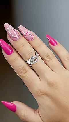 These nails are giving off major “main character” vibes, don’t you think? Rocking a pink so bright, it’s practically glowing, with other nails displaying marble designs. Plus, there is a bling ring on the ring finger. So the nails and the ring are truly complimenting each other.