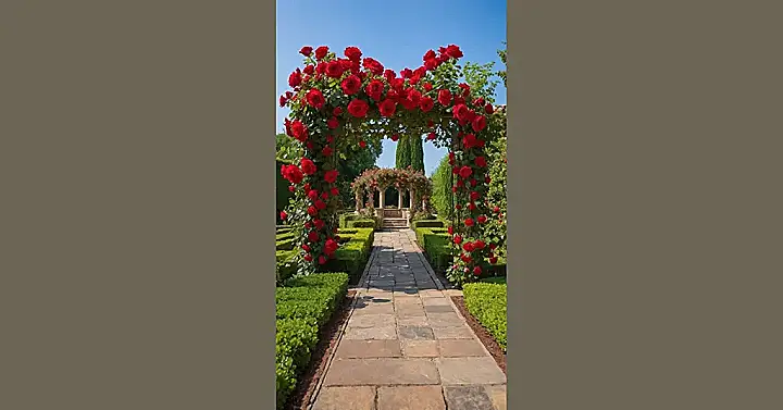Walking through that giant archway of bright red roses feels like you’re about to enter a secret kingdom, or maybe just get a friendly face full of petals. It’s like the garden is rolling out the fanciest red carpet, but instead of velvet, it’s thousands of vibrant blooms all cheering you on as you stroll down the paved path toward whatever cool spot is waiting in the back. You just hope none of the roses are secretly planning a tickle attack with their leaves as you pass.