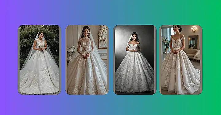 Thinking about ‘dream wedding dresses’ often brings images of gowns that are, well, pretty extra! This one in the photo looks like it could float away on a breeze if it weren’t for the serious amount of fabric. It’s got layers upon layers, lace everywhere, and enough sparkle to compete with a disco ball. Honestly, wearing this might feel like being wrapped in the fanciest, biggest duvet cover ever made, but way more stylish and probably a lot heavier.