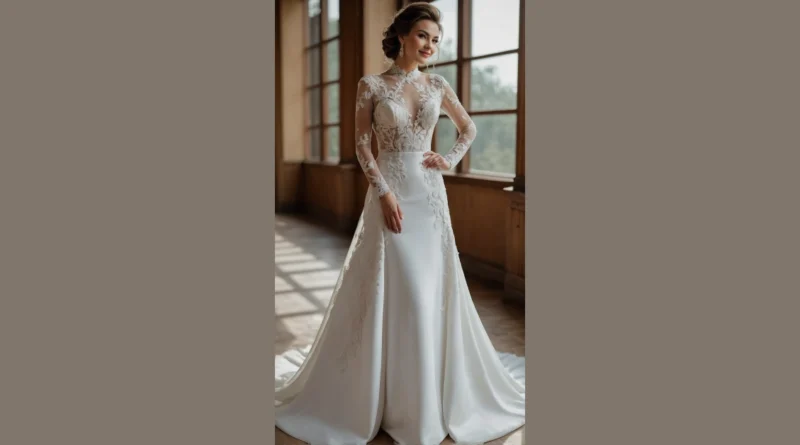 Moving further down, this dress pulls off the amazing feat of being both incredibly elegant and totally comfortable-looking. The smooth, ivory fabric flows like a dream, hugging just enough to make a statement before cascading into a lovely, subtle train that practically begs for a grand entrance. It’s got that classic wedding dress feel but with a modern, sleek twist, making it perfect for someone who wants to look absolutely stunning without feeling like they’re trapped in a giant meringue. Plus, with a smile like that, you know she’s ready to celebrate, probably imagining all the fun she’ll have, even if it means dodging excited toddlers on the dance floor!