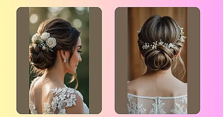 This hairstyle is seriously gorgeous! Imagine walking down the aisle, feeling like a princess with this stunning floral bun. It’s like your hair got a makeover from a fairy godmother—all soft curls, delicate flowers, and a touch of elegance. It’s the perfect mix of romantic and modern, and way better than just a regular old ponytail. You’ll be the fairest of them all, seriously!