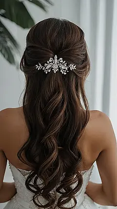 **Paragraph 1:** Check out this gorgeous bridal hairstyle! It’s totally “half-up, half-down,” which is like the Goldilocks of hairstyles – not too up, not too down, just right! The loose curls are super romantic, like something out of a fairytale. And that sparkly hairpiece? It’s like a constellation of tiny diamonds, adding just the right amount of bling without being over-the-top. This is the perfect style for a bride who wants to look elegant but also comfortable and stylish. Imagine dancing the night away without a single strand of hair out of place!