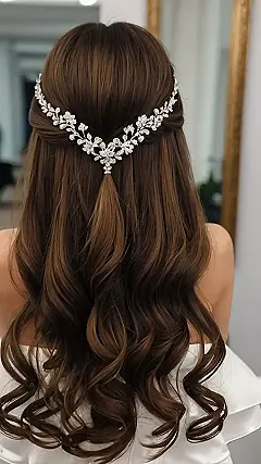 This hairstyle is total wedding goals! Imagine yourself walking down the aisle, looking like a total princess but in a super chill, boho way. Those loose curls are giving major fairytale vibes, and that sparkly hairpiece is the perfect touch – like a tiny constellation just for your hair. It’s the perfect blend of fancy and relaxed, so you can party the night away without worrying about your hair falling apart!