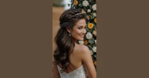 Let’s start with half-up hairstyles that seamlessly blend elegance with that irresistible laid-back charm! Perfect for keeping your hair in check while adding a touch of refinement, you can effortlessly accessorize with a blooms crown or a beautiful veil. It’s like hitting two birds with one stylish stone!