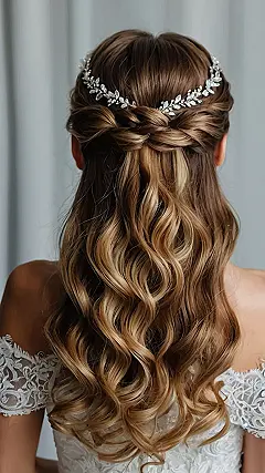 Getting married? This hairstyle is like the ultimate cheat code for looking amazing! Seriously, it’s like your hair gets a fancy makeover where some curls are pinned up all elegant-like, and the rest get to just hang out and do their natural, bouncy thing. Plus, that little sparkly headband? Pure bridal magic! It’s basically saying, “I’m here to party, and my hair is definitely invited.”