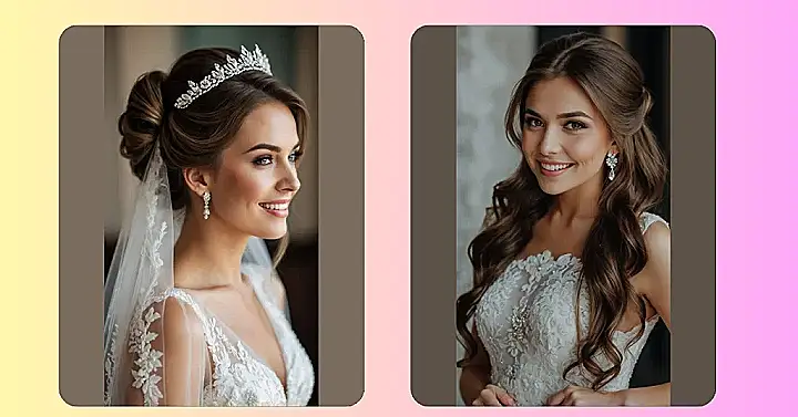 With a smile that bright, you just know this is going to be one epic wedding celebration! While “hair down” is a classic choice, this bride proves that a perfectly sculpted updo, topped with a glittering tiara and a delicate veil, can be just as classy – maybe even more so, especially if you’re planning on tearing up the dance floor without worrying about hair in your face. Her whole look, from the sparkly earrings to the fancy lace dress, just oozes elegance and pure joy, showing everyone how to truly shine on their big day, regardless of whether their hair is up, down, or somewhere in between!