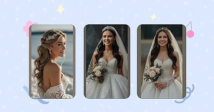 This bride looks absolutely radiant! She’s rocking a beautiful, flowing hairstyle that’s perfect for a winter wedding. Her hair is soft and romantic, with loose waves cascading down her back. The sparkly tiara adds a touch of winter magic, and the veil gives the whole look a dreamy feel. It’s like she stepped out of a fairytale!