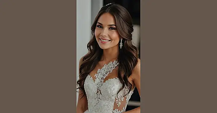 **Paragraph 1:** Wow, check out this bridal hairstyle! It’s “half up, half down,” which basically means part of her hair is pulled up, and the rest flows down in gorgeous waves. Think of it like a perfect blend of fancy and flirty. It’s not too over-the-top, so she can still dance the night away without worrying about stray strands in her face. Plus, those long, luscious waves? They’re total goals! She looks like a princess from a fairytale, but a fairytale where everyone gets invited to the after-party.