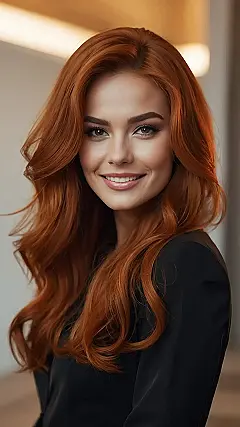 This fiery redhead is definitely ready for fall! Her hair color is the perfect shade of auburn, like the leaves changing outside. It’s a warm, inviting color that’s sure to turn heads. And just like the leaves, it’s got those gorgeous multi-dimensional tones that make it look super natural, almost like she was born with it!