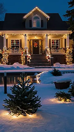 This house looks like it’s straight out of a Christmas movie! Imagine snuggling up inside with hot cocoa, watching the snow fall softly, and seeing all those sparkly outdoor Christmas lights twinkling on the roof and eaves. It’s like someone sprinkled magic dust all over the place, turning a simple house into a winter wonderland. Those lights are definitely brighter than my math test grades, but in a good way!