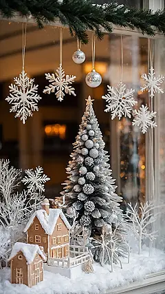 Talk about a glow-up! This Christmas window display looks like it just won the winter wonderland lottery. We’ve got a whole squad of giant snowflakes hanging out, probably gossiping about who has the best frosty edges, while a perfectly preened mini Christmas tree stands tall, sporting more silver bling than a pop star on tour. If windows could brag, ours would be flexing its festive muscles right now, showing off what happens when you let your inner holiday spirit go wild with a hot glue gun and a mountain of fake snow, making it the coolest of Christmas window decorations.
