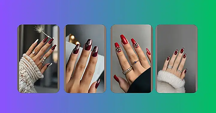 These nails are like a fancy fall outfit for your fingers! Imagine wearing a cozy sweater with a super chic red dress and a sparkly belt. That’s basically what this look is like, but for your hands! The deep red is like the sweater, the sparkly silver design is like the sparkly belt, and the classic french tip makes it super stylish. If you’re trying to figure out how to spice up your next nail appointment, these are definitely a good place to start!