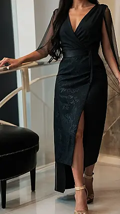 This dress is so fancy, it practically walks itself! Imagine gliding into your Christmas party, feeling like a total queen in this elegant black number. It’s got that classy vibe down pat with the wrap style and subtle detailing, but the sheer sleeves give it a touch of modern edge that screams “I’m not messing around!”. It’s the perfect outfit to make all the other party-goers wish they were as stylish as you. You’ll be the star of the show, without even trying too hard!