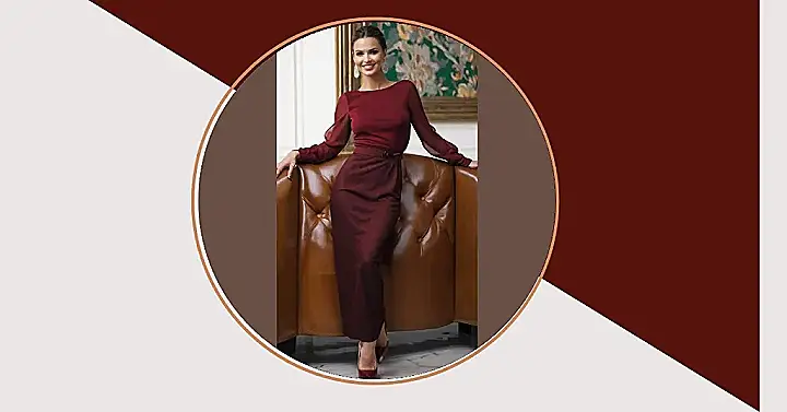 That dress is seriously fire! Imagine showing up to the Christmas party looking like this – all fancy and classy, ready to jingle all the way to the top of the “best-dressed” list. It’s like a grown-up version of your favorite holiday outfit, but way more sophisticated. The rich burgundy color is perfect for the season, and the sheer sleeves add a touch of elegance without being too over-the-top. You’d totally steal the show, even if your only dance move is the “awkward holiday shuffle.”