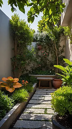 And look at that little path! It’s like a miniature runway leading to… more plants? Those puffy green bushes are trying really hard to look sophisticated and maybe act like bodyguards for important garden gnomes, but they just remind me of fluffy green meatballs someone forgot to cook. This whole setup is probably waiting for someone to show up with pasta, because what’s an Italian vibe without food, right? It’s definitely got that cozy courtyard feel, even if it’s just pretending to be fancy abroad.