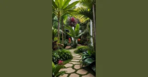 Look at all those plants having a leafy rave! Some are tall and dramatic like they’re auditioning for a play, and others are small and bushy, probably gossiping about the big ones. There’s even a little bench that looks perfect for plotting world domination or just eating a snack without anyone seeing. The path is like a walkway of giant cookies, leading you deeper into this green escape where the only thing you have to worry about is which plant smells the nicest.
