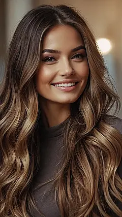 This picture shows a girl rocking some seriously gorgeous hair! It’s called “bronde” – a fancy word for a mix of brown and blonde. Imagine a yummy caramel sundae with a scoop of vanilla, and you’ve got the idea! Bronde hair is like that – a sweet blend of colors that looks super natural and totally fabulous.