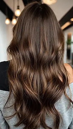 Looking at this hair is like discovering a secret treasure chest of chocolate and caramel. It’s got those amazing wavy layers that look so glossy and healthy, you almost want to ask for its skincare routine. This isn’t just hair; it’s a whole vibe, a ‘rich brunette’ masterpiece that probably gets compliments from strangers on the street. Seriously, it looks like it smells fantastic and has its own theme music.