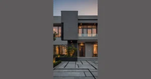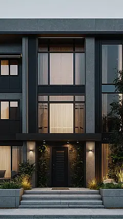 This house is seriously fancy, even for Bloxburg! It’s got all the sleek, modern details you could ask for, like the huge windows, the dark grey walls, and those cool little plants hanging by the door. You could practically imagine yourself walking up the steps and into this awesome house, right?