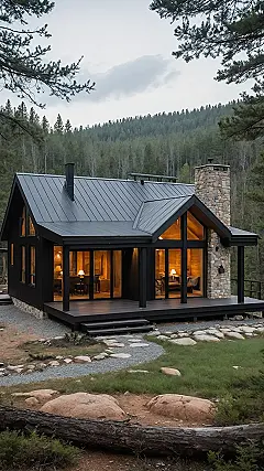 Lost in the woods? Nah, you just found the coolest spot to hide from your homework! This isn’t your grandpa’s dusty old shack; this sleek, dark cabin pops right out of a design magazine, nestled perfectly among those super tall trees. With its big, bright windows and modern angles, it looks like it’s saying, “Yeah, I live in the forest, but I also have excellent Wi-Fi and probably a fancy coffee maker.” It’s the kind of place where you expect to see a deer photo-bombing your selfie because the cabin is just that inviting.