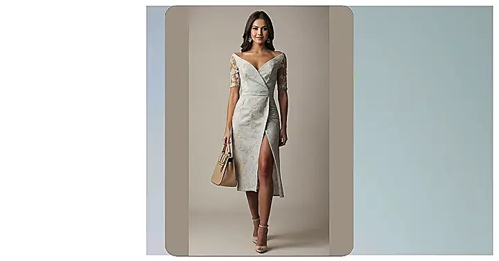 Now, let’s talk about that leg slit! It’s just enough to add a little spice without getting you in trouble with Grandma, while still giving you plenty of room to totally rock the “walk-of-fame” down the gift aisle. Paired with those cute nude heels and that perfect little purse, you’re not just dressed, you’re *accessorized* to the max. This isn’t just a dress; it’s your secret weapon for looking effortlessly cool, even if you’re secretly just there for the cake and to pretend you understand what “kitchen registry essentials” really are.