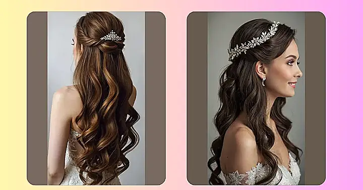 This hairstyle is like when you try to “accidentally” look cute for your crush, but dial it up to eleven for, like, a wedding! You’ve got the gorgeous, flowing waves that say, “Hey, I woke up like this,” but then BAM! That headband comes in, shining brighter than your future together, and screams, “Actually, I spent three hours perfecting this!” It’s the perfect balance of effortless and “I’m totally trying really hard,” which, let’s be honest, is most of us on picture day anyway.