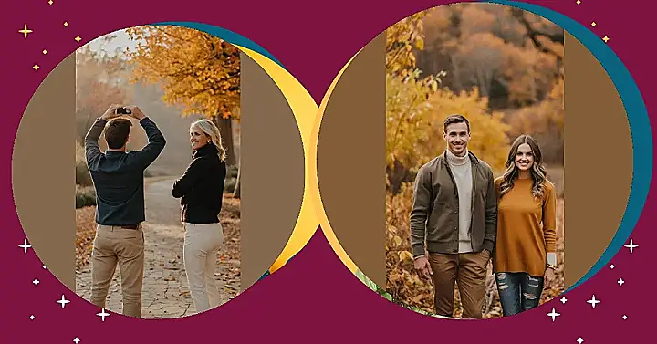 Let’s be honest, though, those warm colors are probably helping to keep them warm! Fall in some places can be chilly, so picking comfy, layered outfits is a must. Who wants to be shivering during the photo shoot? This couple is clearly nailing it. They look cozy, stylish, and perfectly in sync with the season. Their picture is totally giving us “fall feels” and making us want to grab a pumpkin spice latte and enjoy the autumn weather!