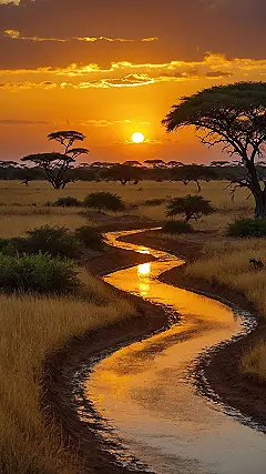 Wow, check out this photo! That winding stream looks like it’s been dipped in liquid gold, reflecting the sun’s epic exit. It’s like the sky decided to spill a giant orange and yellow smoothie all over Africa, and this little river caught the perfect splash. The trees are just standing there looking cool, like they know they’re part of this amazing show, totally nailing the “beautiful Africa photography” vibe without even trying.