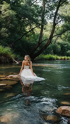 Stepping into a river for a photoshoot might sound like a super chill way to get some amazing pics, and honestly, it really is! Look at this gorgeous shot; the sunlight glinting off the water and those lush green trees make for the perfect natural backdrop. Our model here is absolutely rocking that flowing white dress while probably trying not to think about how cold the water might actually be or what slippery rocks are lurking underfoot. It takes some serious grace to look this effortlessly stunning while navigating a stream!
