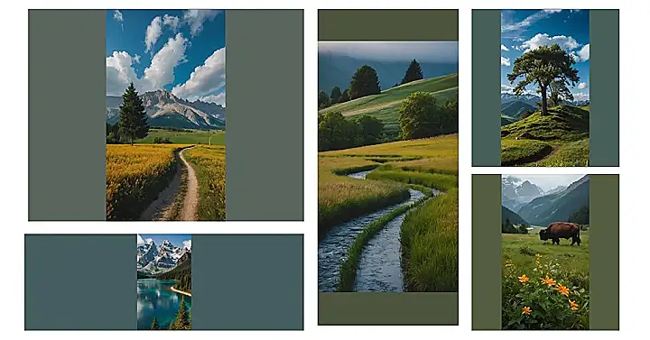 This picture is like a beautiful song that nature is playing for us. It’s got rolling hills, a little stream, and a sky so blue it looks like it’s been painted. The fluffy clouds are like cotton candy floating across the canvas, and the green grass looks so soft you could just sink right into it. You can almost hear the gentle whisper of the wind through the leaves and the soft murmur of the stream as it flows along.