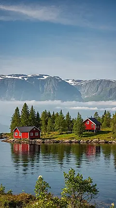 You know that feeling when you try to take the perfect selfie and everything just lines up? Well, this Norwegian landscape basically did that naturally, without even trying! We’ve got these two super cheerful red cabins, looking like they just popped out of a fairy tale, chilling lakeside with their own private forests. They probably spend their days boasting to each other about whose reflection in the glassy water is clearer, while the majestic snow-capped mountains in the background are just silently judging their tiny arguments.