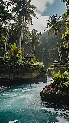 Taking travel photos in Bali is like playing a real-life version of Jumanji, but way more relaxing and less likely to involve stampedes. Look at that scene! You’ve got crazy-cool river rapids, mini-temples chilling on cliff tops, and palm trees reaching for the sky like they’re trying to get a high-five from God. If your camera can’t capture this magic, you might need to upgrade to a Hollywood-grade rig or just accept that Bali is too awesome to be fully contained in a single snapshot.