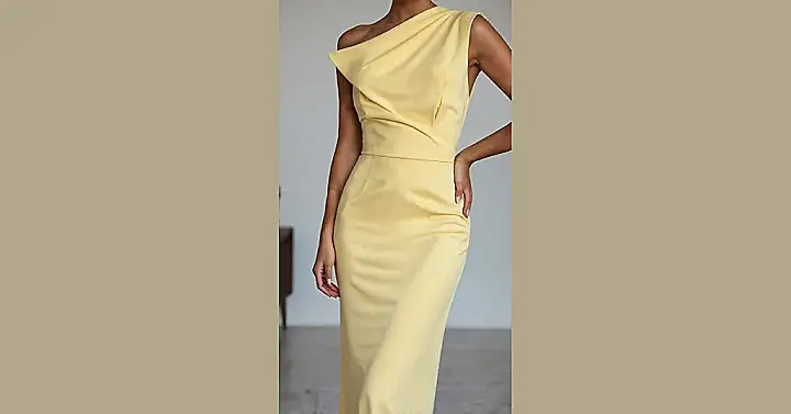 You know that feeling when you see something so perfect, you just want to *chef’s kiss* it? That’s exactly how we feel about this butter yellow dress. It’s not just yellow; it’s that creamy, dreamy shade that makes you look like you just stepped out of a fancy pastry shop – in the best way possible! Plus, that one-shoulder detail? It’s basically saying, “I’m chic, but I’m also ready to throw my other shoulder into some serious dance moves.” It’s a dress that’s bright enough to make the sun jealous, but subtle enough not to shout, “Hello, gorgeous!”