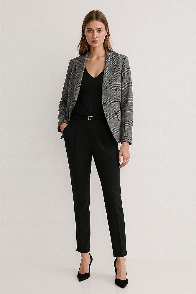 The tailored blazer and sharp black pants create a sophisticated silhouette, proving that ‘kate middleton workwear’ is the epitome of chic comfort. This look is a versatile choice for achieving an effortlessly put-together and professional appearance.