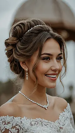 But hold up, it’s not just the hair bringing the magic! Check out that amazing smile – it’s practically brighter than the stunning diamond necklace and earrings she’s rocking. With her hair on point and that radiant glow, she’s basically saying, ‘Yeah, I’m getting married, and I look pretty awesome doing it!’ This whole look screams ‘happy bride goals,’ proving that when your hair is stunning and your smile is genuine, you’re ready to conquer the wedding aisle and maybe even a few awkward dance moves at the reception.