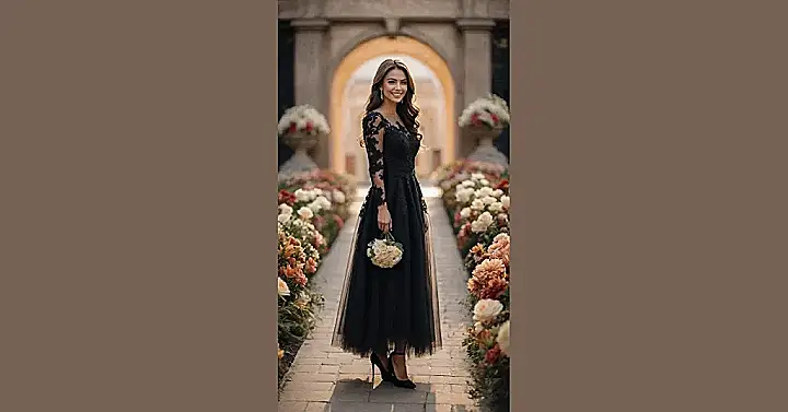 Finding the perfect wedding guest outfit can feel like a mission impossible, right? You want to look amazing, but definitely not so amazing that you accidentally outshine the bride (unless it’s a ‘friendly competition’ situation, wink wink!). This stunning black dress is basically the secret weapon for any upcoming nuptials. With its dreamy lace sleeves and floaty tulle skirt, it’s giving off major ‘I woke up like this, but also spent hours planning this flawless look’ vibes. Plus, black is always a power move – it says, “I’m here for the love, the cake, and maybe a little gossip.”