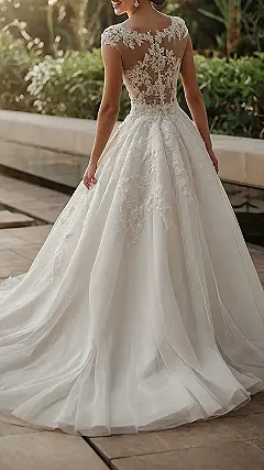 This isn’t your grandma’s white wedding dress! Look at all that gorgeous tulle – it’s like a cloud you could practically float away on. And that back? Wowza! All that delicate lace is seriously stunning. It’s like someone sprinkled fairy dust all over it. Imagine twirling in this beauty – you’d be the fairest princess at any wedding, even if you’re just trying it on in a shop or looking at pictures online. Seriously, this dress is giving “fairytale wedding” vibes!