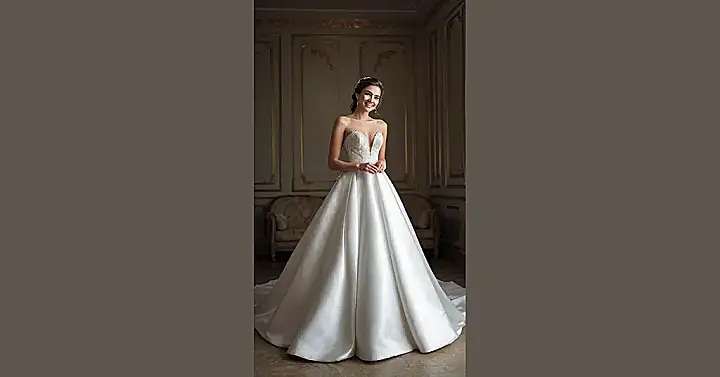 Wow, check out this gorgeous white wedding dress! It’s like a princess gown went to a fancy tea party – all satin and shimmer, with delicate champagne-colored lace adding a touch of “ooh la la.” The long sleeves are super elegant, and that criss-cross neckline is seriously stylish. It’s the perfect blend of classic elegance and modern chic, making it ideal for any bride who wants to feel like a total queen on her big day.